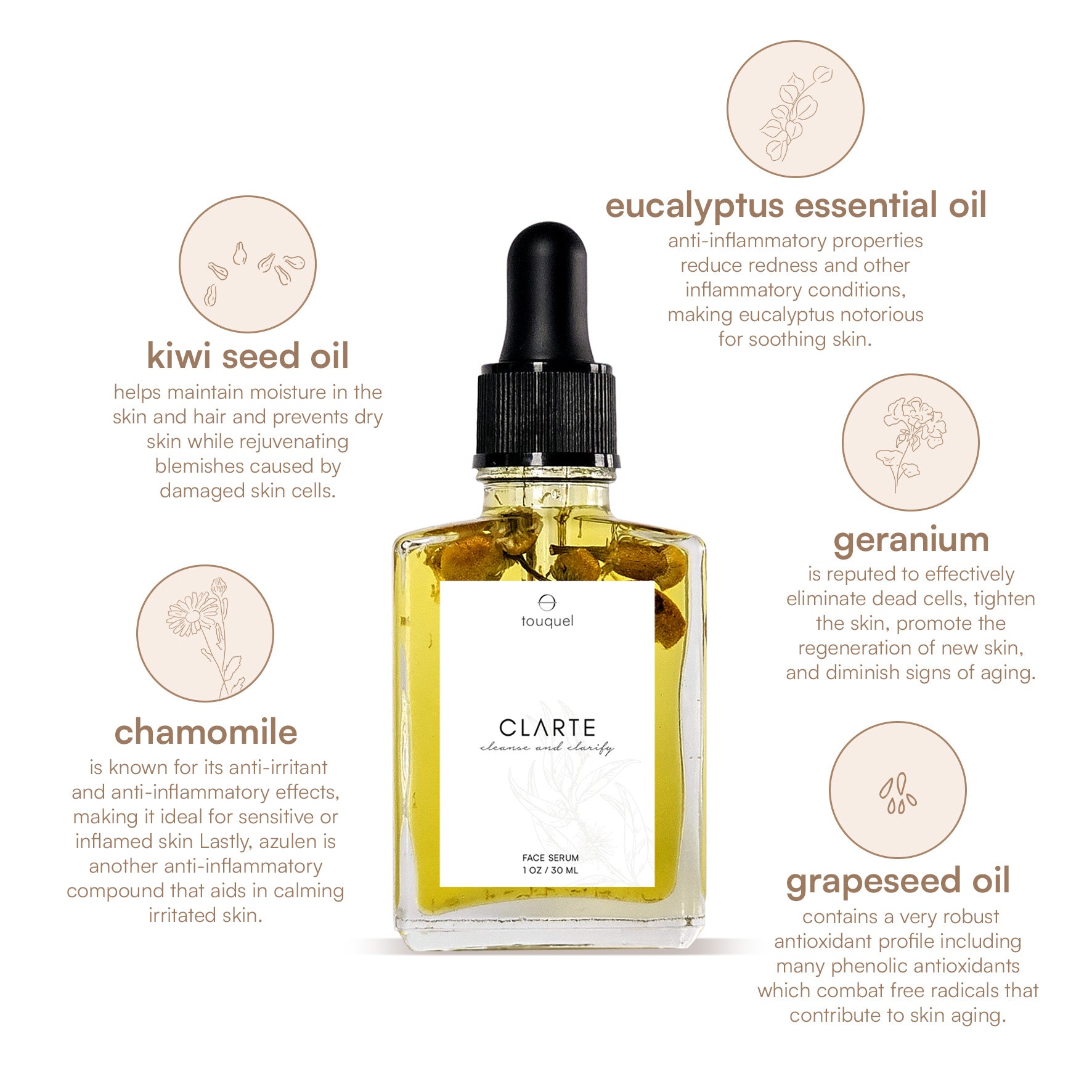 Introducing our revitalizing cleansing and clarifying body and face oil meticulously crafted with a blend of nature's finest ingredients to rejuvenate and soothe your skin. Infused with the nourishing Actinidia deliciosa oil, also known as kiwi seed oil, this elixir delivers a burst of vitamins and antioxidants, leaving your skin radiant and refreshed. Harnessing the power of Vitis vinifera oil, or grapeseed oil, this lightweight formula deeply cleanses and balances your skin, while imparting a luxurious softness.