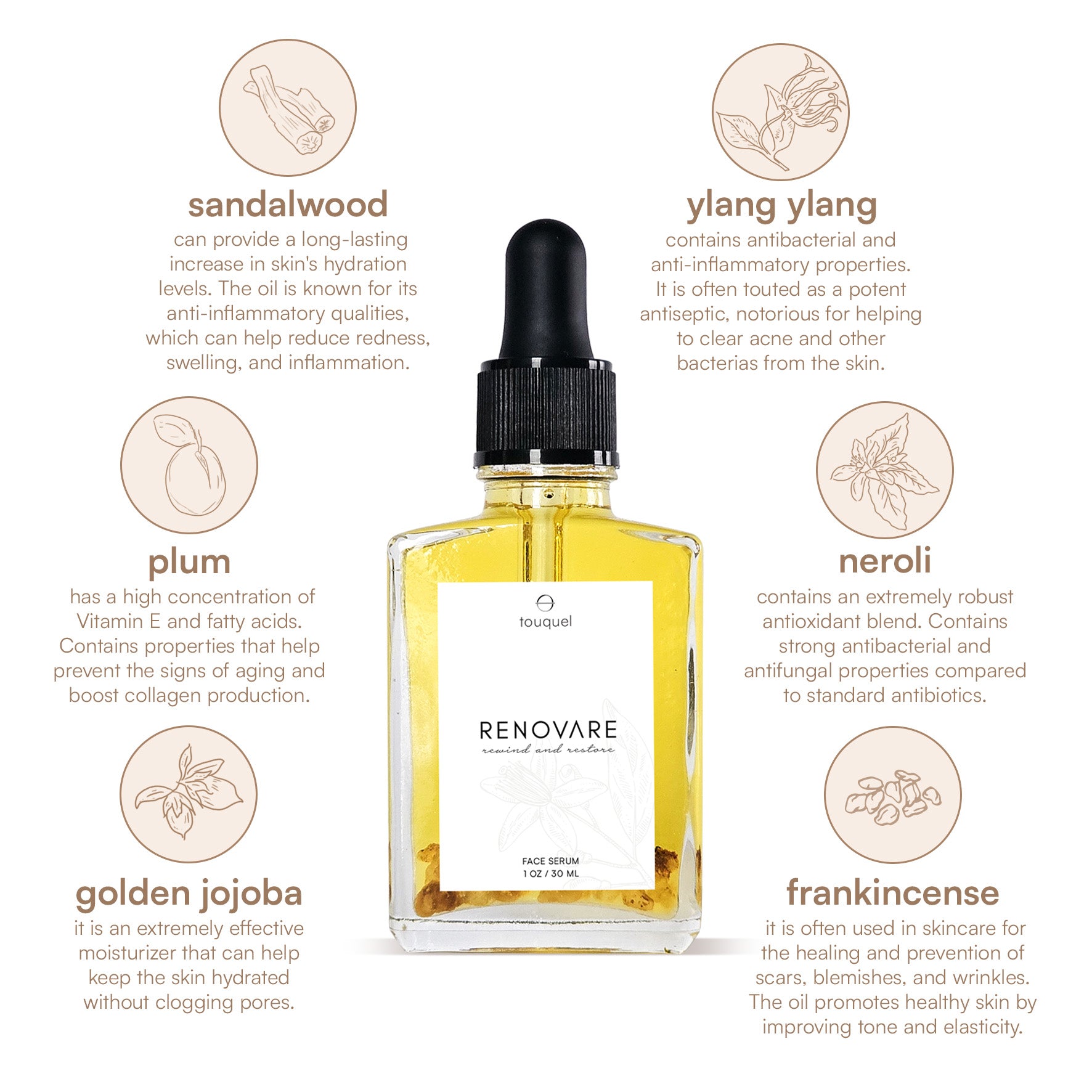 Enriched with the delicate fragrance of Cananga odorata essential oil, or ylang-ylang, our elixir indulges the senses while delivering potent anti-aging benefits to the skin. Santalum album essential oil, sourced from sandalwood, offers additional nourishment and hydration, leaving the skin velvety-smooth and supple.