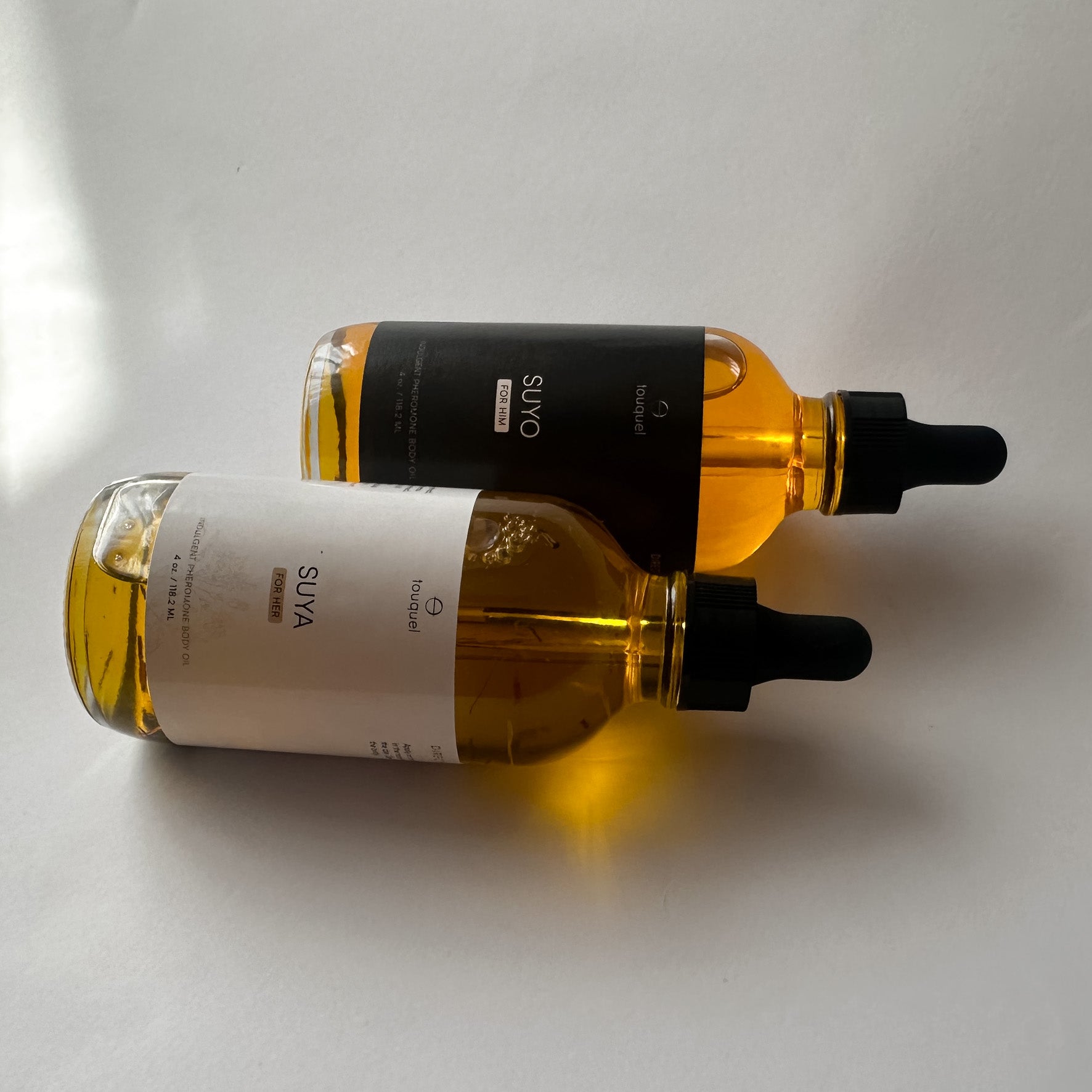 A luxurious bundle designed for two. Awaken confidence, enhance attraction, and nourish skin from head to toe—naturally. SUYA is a radiant fusion of rosehip seed, jojoba, marigold blossom, jasmine tea, and a delicate touch of female pheromone concentrate, created to hydrate, balance, and leave a soft, alluring trail of scent and feminine energy. SUYO is its magnetic counterpart—a grounding blend of golden jojoba, sea buckthorn, sandalwood, and male pheromone concentrate that deeply conditions skin and hair while evoking warmth, strength, and presence. Both oils absorb effortlessly into the skin, offering reparative benefits, mood elevation, and a scent that lingers with intimacy. Use separately or together—this is a sensory experience for modern attraction, healing touch, and empowered connection.
